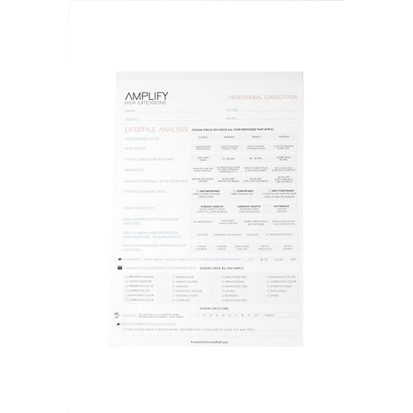 The Amplify hair consultation pad is the ultimate conversion tool for getting your clients to tell you what you already suspect is true; thicker fuller hair today. Each section is designed to gather the most useful information about your client’s hair. By identifying where they are now, where they want to be, and by when, you will not only ensure their expectations are met but deliver the service that will have your client absolutely in love with their hair.